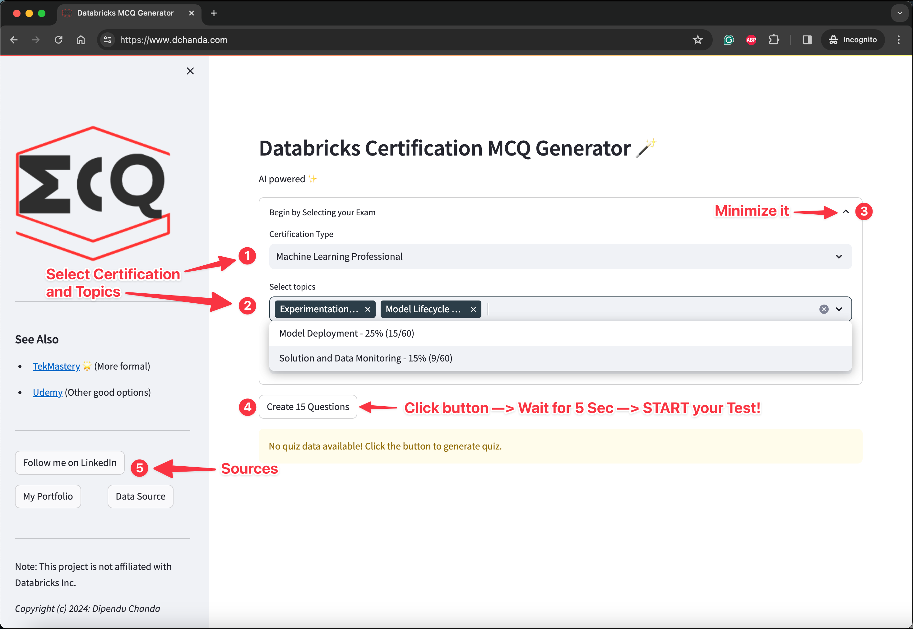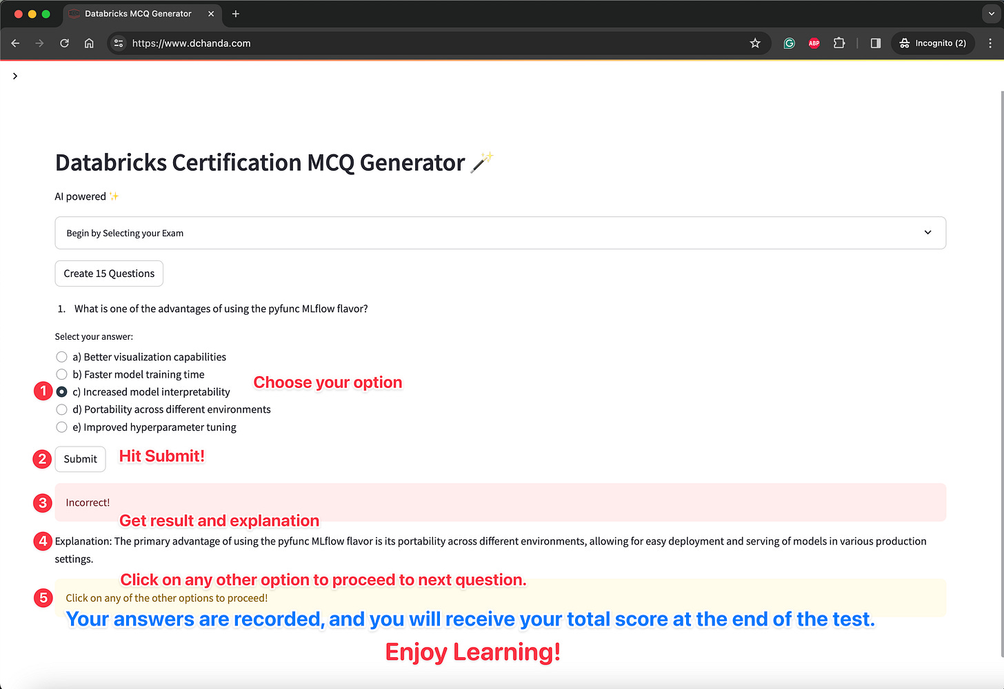 The Databricks Certification MCQ Generator was built with the Databricks community in mind — for not just us internally working at Databricks to prep but for the broader users. As such, I invite feedback, suggestions, and insights from all users to continually improve this tool.